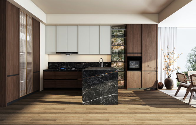 通过必一·运动(B-Sports)厨柜量体裁柜,定制出适合主厨下厨的烹饪区和洗涤区的舒适高度。